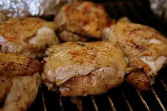 - Grill chicken over a preheated charcoal grill, turning often, for 10 minutes. Cook, turning often and brushing with sauce when turned, until internal temperature reaches 165°F in the breast and 170°F for the dark meat.