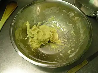 Beurre manié, meaning "kneaded butter", is a paste made from equal volumes of butter and flour. It acts a thickener for soups and sauces.[1]