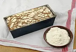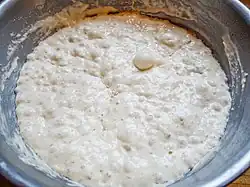On the other hand, the "preferment" or "indirect" mixing method builds the final dough in separate stages, with an intermediate fermentation stage between them.[6][8] Owing to the long fermentation time, this type of dough creation results in more complex flavor and improved texture,[8][7] especially in breads with a proportion of non-wheat flour like rye. There are several types of pre-ferment, which range in texture and fermentation style. A pâte fermentée is just a piece of bread dough from a day or two prior that has been kept in the fridge.[6] A sponge combines a recipe's yeast, liquid, and half the flour, allows this mixture to ferment for about an hour until doubled, and then mixes in the remaining flour and other ingredients.[6][8] A poolish is a thin mixture of approximately equal weights flour and water, with variable quantities of yeast depending on the desired fermentation time—less yeast and water means a longer fermentation. The poolish is then allowed to ferment a little past its peak rise (typically several hours) before incorporation into the final dough.[6][7] A biga is a stiff mixture of only 50% hydration and 1% yeast that is allowed to ferment for 16–18 hours before incorporation into the final dough.[6][7] Due to the lower hydration, bigas tend to be more stable over time than thinner pre-ferments like poolish.[7] A sourdough starter is a long-term, living mixture that sustains an ongoing population of wild yeast and bacteria in a flour-and-water mixture.[3][6] It must be regularly fed, and it contributes complex, sour flavors to the final dough that incorporates it.[6] A levain or leaven sponge is simply a sponge that uses sourdough starter instead of commercial yeast.[7][11][12]