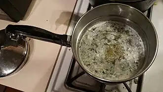 If its psychoactive properties are desired in a dish, cannabis must first be ground and decarboxylated to convert its THCA content into the psychoactive compound THC.[3][4] This can be achieved in a couple ways. The first is to bake it on a sheet pan for 30–40 minutes at 220°F (104°C).[3] The resulting product can then be incorporated into foods as desired. Alternatively, the cannabis can be placed in a container, which is then put in a simmering water bath for 1 hour.[4] If you want to infuse a fat (e.g. butter or oil) with cannabis, you can add it to the cannabis during the heating step. Whatever method you use, make sure not to heat the cannabis too much or for too long—this will cause the psychoactive compounds to volatilize and/or degrade. Once decarboxylated, the cannabis may be stored or used in cooking.