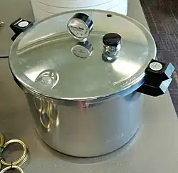 To use a reputable pressure canner for pint jars or smaller, begin by filling with at least 2–3 inches (5–7.5 cm) of water, or more if called for by a reputable recipe.[2][3] Place the filled jars on the rack, and cover with the lid.[2] Do not close the vent or apply the weight or pressure regulator at this point.[3] Raise the heat to bring the water to a boil, and wait until the vent is releasing a steady column of steam for at least 10 minutes straight[2][3][12]—this is critical to ensuring the canner is completely full of steam, and failing to achieve this step can result in insufficient temperature and underprocessing.[3][12][17] Follow the manufacturer's directions to close the vent and apply the pressure gauge or weight as applicable,[2][12] and make sure the canner reaches the pressure required by the recipe.[12] With dial gauges, the readout should indicate the desired pressure or greater; with weighted gauges, the gauge will rock or jiggle continuously when the correct pressure is attained.[3] Once correct pressure is reached, begin timing the required processing time.[2][12] If the pressure dips below that specified, restart the timer.[2][3] Turn off the heat, and let the entire canner cool at ambient room temperature until the pressure returns to zero, plus two minutes, before removing the weight or pressure regulator.[2][12] Do not force depressurization.[3] Let the entire setup cool for another 10 minutes before removing the lid to prevent siphoning.[2][12]