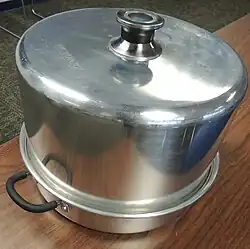 Though not initially recommended,[3] atmospheric steam canners were approved by the NCHFP around 2015 for use whenever boiling water baths may be used.[17][27] These are not the same as pressure canners, which use pressurized and not atmospheric steam. Their chief benefit is the lower water requirement for operation. The principle is the same as the above, since the steam at atmospheric pressure has the same temperature as boiling water, and the processing time will the the same as for a boiling water canner, with adjustments for altitude as appropriate.[2] Due to the risk of the water boiling dry, steam canning is not recommended for processing times greater than 45 minutes.[2][17]