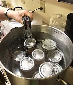 Once jars are filled and closed, they must be processed for the correct amount of time in the appropriate medium (see below). The type of processing and the exact duration are determined based on the specific characteristics of a given recipe and the size of the jar.[6] It's important to make sure that the processing is long enough to allow sufficient heat to fully penetrate through the jar and eliminate any microbes of concern, and this amount of time is different for every recipe. Examples of things that can affect this time are viscosity, size of food particles, altitude, water circulation, jar shape and proportions, headspace, and acidity[6][9]—regarding this latter point, it may take more or less heat/time to neutralize certain microbes under varying acidities.