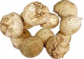 The roots are large and generally rounded in shape, with a bumpy tan/brown exterior.[1] The inner flesh is white and crisp,[1] like that of parsnip, rutabaga, and kohlrabi.[2][3] Flavor-wise, they are overall milder than celery stalk but still have an aromatic flavor like it and parsley.[1][4]