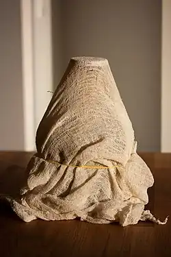 Cheesecloth is a loosely-woven cotton cloth or gauze typically used in cooking. It can be used to strain liquid from foods like cheese curds or to enclose aromatics during cooking.