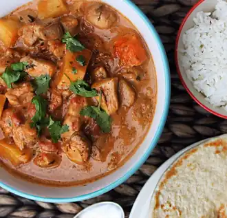 Chicken tikka masala is a dish based on chunks of Indian-style roasted chicken (Chicken Tikka) cooked in a tomato curry sauce, originating in India. There is no standard recipe for chicken tikka masala; a survey found that, of 48 different recipes, the only common ingredient was chicken.[1] The sauce usually includes tomato and either cream or coconut cream and various spices.