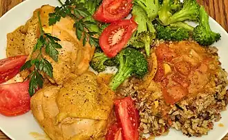 - Place rice in the middle of your serving plate, place the grilled/barbecued chicken on top, sprinkle with a squeeze of fresh lime juice, and serve with a green salad.