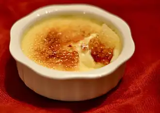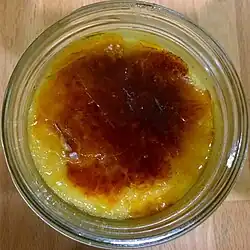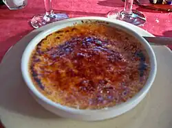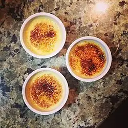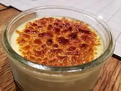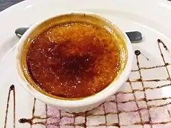 Crème brûlée, also called burnt cream or Trinity cream, is a sweet baked custard topped with a layer of hard caramelized sugar. Its exact origin is debated, but it arose in Western Europe by the 17th century. It should not be confused with crème caramel.
