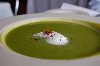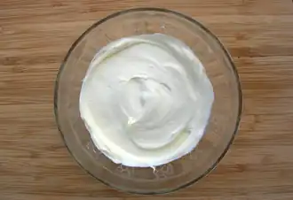 Crème fraîche is made either by allowing raw cream to culture naturally or by introducing lactic acid cultures to pasteurized cream.[2][3] This process results in a slight acidification, which thickens the cream and gives it a tangy flavor.[4][3][5] In general, the cream used has at least 30% fat, which makes the product smooth and rich.[4][6] The exact texture varies slightly, and it can be thin to thick,[2] depending on the culture time and amount of moisture left in the final product.