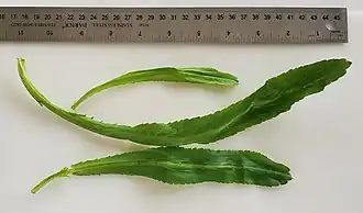 Culantro (also known as Bhandhanya, Chandon benit, Culantro, Culantro Coyote, Fitweed, Long coriander, Mexican coriander, Wild coriander, Recao, Spiritweed, Ngò gai, Sawtooth, and Saw-leaf herb), is the leaves of the herb Eryngium foetidum.[1][2] It is native to Mexico and South America, but is cultivated worldwide.[1] In the United States, where it is not well-known,[3] the name culantro sometimes causes confusion with Coriandrum sativum, the leaves of which are known as cilantro.
