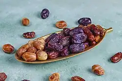 Dates are oblong, with a thin papery skin and a single central seed.[1][2] The color can range from deep golden to dark brown, depending on the variety.[1] They have a high sugar content, making them sticky and sweet.[1][2][3]