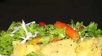 Dhokla is a Gujarati snack that is made with black gram. It is not to be confused with khaman, a variant made from besan (chickpea flour). It is eaten as a side dish with the main meal and is usually tangy and slightly sweet in taste.