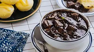 Dinuguan (pork blood stew) or dinardaraan in Ilocano is a Filipino dish usually made from the blood, entrails and meat of a pig. It is sometimes known as "chocolate meat" as the stew has a thick chocolate-like color and consistency. The name "dinuguan" is derived from the Filipino word "dugo", meaning blood. Likewise, in Ilocano, "dinardaraan" is derived from "dara", meaning blood. Dinuguan has more liquid, while dinardaraan is drier. It is most often served over rice or puto (sweet steamed rice muffins).