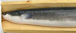There are a variety of marine eels, but the one most commonly eaten is the conger eel or anago.[1] It has a brown-colored skin and pointier, bony tail, with leaner meat than that of freshwater eels.[3][4]
