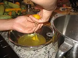 Separating eggs is when the yolk and the white are physically separated from each other. One traditional way to separate an egg is to crack the egg into two roughly equal parts, and pass the yolk from one half of the shell to the other, letting the white fall into a bowl below; however, this runs the risk of breaking the yolk with the shell and contaminating the white with it. A simpler way is to crack the egg into your clean hand and let the white run through your fingers.[2] Similarly, you can crack the entire egg into a bowl and gently scoop the yolk out with your hands.[2] Generally, it is easier to separate eggs when cold, since the yolks are slightly firmer and will puncture less easily.[2]