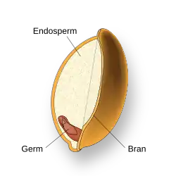 A typical grain has three primary parts: the bran, endosperm, and germ. The bran is the outermost layer and has high fiber and protein contents.[7] Next, the endosperm makes up the bulk of the grain, and it consists mainly of starch with some protein.[7] Finally, the germ is the smallest portion and contains largely protein and fat.[7]
