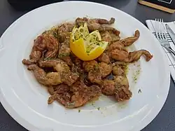 Traditions of eating frogs exist in many cultures worldwide. In the Western cuisines that do so tend to serve only the legs separated from the body.[2][7] Here, they are often fried or poached and served with a flavorful sauce to complement the mildness of the meat.[7] In Filipino cuisine, frogs may be stuffed and fried; in Cantonese cuisine, they may be fried or served in soup.[2]
