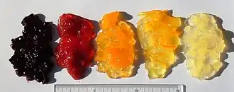 Just about every fruit can be made into preserves,[2] though they will all produce preserves with different characteristics. Fruits with relatively low acidity (e.g. ) will need supplemental acid, and fruits with low pectin (e.g. strawberries, raspberries, peaches) will need to be supplemented by either pectin-rich fruits (e.g. grapes, apples, quinces, cranberries) or by commercial pectin.[3][4][8][9] While the fruit does not need to be particularly attractive, it should not be moldy or otherwise low quality.[2][3] Additionally, note that overripe fruit will have lower pectin than slightly underripe fruit.[2][3][5]