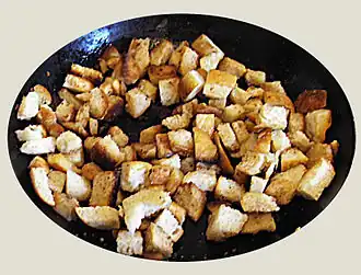 Garlic croutons can be purchased but are much better when made from old bread. They are a crucial ingredient of Caesar Salad.
