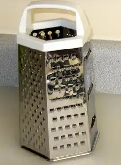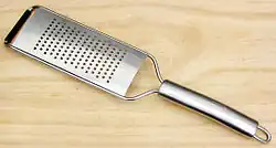 A grater is a kitchen utensil that is usually made from metal (and sometimes ceramic or even wood), with sharp perforations or protrusions used to shred food. Graters come in various sizes: from those with larger perforations which are often used to shred cheese and vegetables, to the very fine graters and micro planes that can be used to zest citrus fruit. Micro planes are preferred by many for their efficiency in producing finely grated food. Fresh ginger or wasabi graters are usually made from porcelain or bamboo, and use spikes or ridges to tear those fibrous rhizomes (they are not clogged with fibres like conventional graters).