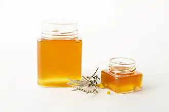 Honey is a sweet and viscous syrup produced by bees from the nectar of flowers.[1][2][3][4]