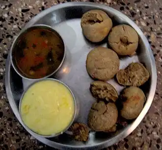 Baati is a hard, unleavened bread cooked in desert areas of Rajasthan, Malwa, and Gujarat in North India. It is prized there for its exceptionally long life and high energy content, as well as the minimal quantity of water required in its preparation.