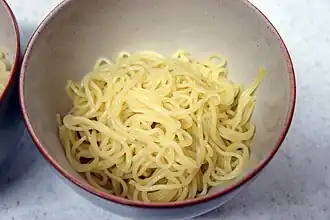 Jjolmyeon noodles are often mixed with a spicy sauce and vegetables to make the noodle dish of the same name.[1][2][3]
