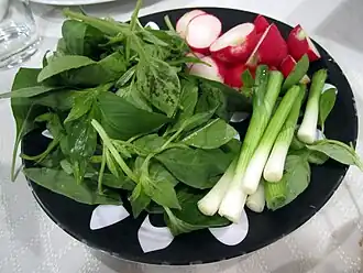Kanachi (Կանաչի -- Armenian for herbs) consists of an assortment of various aromatic and tasty herbs that are served raw as an appetizer and/or side dish next to main courses of Armenian dishes. There is also a Persian cuisine equivalent called sabzi khordan.