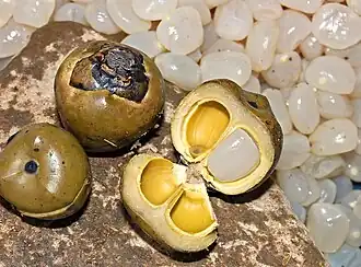 The fruit grows in tough pods that become yellowish-black when ripe.[1] The edible portion consists of the translucent white pulp segments,[1] which have a soft and chewy texture and mild flavor.[1][2] The segments are often sold in syrup, sometimes dyed bright colors.[1][2]