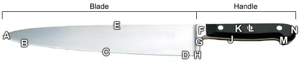 | M. | Handle guard | The lip below the butt of the handle, which gives the knife a better grip and prevents slipping |