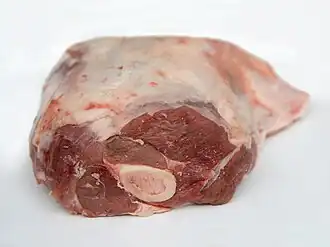 | Shank | Shin region of the leg;[4] consists of tough lean meat and connective tissue;[4][5] may be cut into cross-sections;[5] often braised to tenderize it.[7][10] | |||||