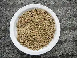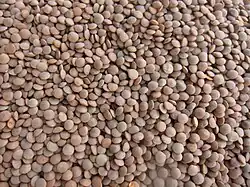 A number of lentil varieties can be found.[8][9] Generally, they can be divided up into larger, flatter, mushier varieties versus smaller, firmer, rounder varieties.[6][8] The table below describes some common varieties.