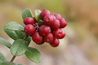 The lingonberry, also called cowberry, partridgeberry, and lowbush/mountain cranberry,[1][2][3] among other names, is the fruit of Vaccinium vitis-idaea. It is native to the northern hemisphere and part of many cultures' cuisines.