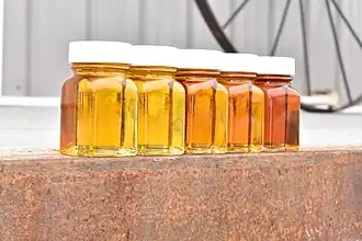 Finished maple syrup has a solids content of about 68%, consisting primarily of sucrose (~62%), with traces of glucose and fructose (~3%) as well as amino and other acids.[1][7][8][12] The flavor is complex,[1] due in part to Maillard browning and specific flavor compounds such as vanillin,[5][7][12] and the color is golden amber to brown.[2] However, different grades of maple syrup do exist as determined by the syrup's color and flavor.[1][2][3][7] As the color darkens, the flavor becomes stronger;[4] at the lightest end of the scale in both color and flavor is "golden with delicate taste", followed by "amber with rich taste", "dark with robust taste", and "very dark with strong taste".[1][3][11] The grade is associated with the point in the season at which the sap is collected, so lighter syrups are produced earlier, and they trend darker from there.[7][11] Harold McGee also notes that longer and hotter boiling leads to darker color and stronger flavor, and late-season sap tends to need longer boiling due to a lower initial sugar content.[12] Other factors that influence maple syrup flavor include climate and soil type.[5]