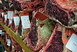 Two primary types of aging exist: wet and dry. In wet aging, fresh meats are vacuum-packed and kept under refrigeration for varying amounts of time,[3][5][14] depending on the meat. Often, wet aging simply takes place during the time it takes to bring the meat to market,[3][14] especially for meats that are only aged for a few days. Dry aging, on the other hand, is a much more resource-intensive process. Here, large cuts of meat are hung up in cold storage with controlled humidity, temperature, and airflow such that the meat is exposed to air on all sides during the aging process.[1][5][12][14][15] Over the course of dry aging, the meat loses a significant amount of moisture,[14] which concentrates the flavor.[3][8] During this time, the outer layers may dry out and grow mold, and this layer will need to be trimmed off and discarded.[14] Typically, it is meats like beef and lamb that get dry aged,[5] and these meats are expensive due to the yield loss and effort required.[5][14][15] However, the quality may be considered better than that of wet-aged meat due to the flavor concentration.[3][12]
