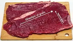 The direction in which the fibers run determines the grain of the meat[3][6][16]—when a recipe instructs you to cut against or across the grain, it means to cut perpendicular to the direction the fibers are running[14]. The grain can be anywhere from fine to coarse, with the former having smaller fibers making smaller bundles, and the latter having large fibers and bundles.[5]