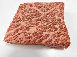 As the name implies, fatty or adipose tissue is that which stores fats in meat, either for energy or protection.[3][12] These fatty deposits are distributed in various places throughout the animal,[12] where they have different characteristics. Subcutaneous fat deposits are stored just beneath the skin (e.g. pork fatback).[3][6][9][12] Deeper within the carcass, visceral fat surrounds internal organs,[1][12] such as the kidneys, guts, and heart.[3][6] Caul fat is a specific lacy network of fatty tissue in the abdomen of some animals.[3] Fatty tissue specific to muscles includes the inter- and intra-muscular fats. Intermuscular or seam fat is located between whole muscle groups,[3][6][12] while intramuscular fat is deposited within the muscle fibers. When this intramuscular fat is significantly and evenly speckled through the tissue, it is referred to as marbling,[1][3][12] and it adds tenderness by disrupting the muscle tissue.[3][5][14] Not all meat has intramuscular fat—poultry, for example, does not contain it.[14]