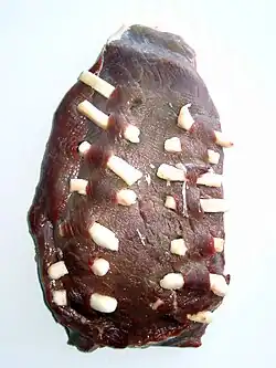 Because fat prevents against moisture loss,[5] lean cuts of meat can dry out during dry cooking. One way to avoid this is the application of fatty tissue to the cut. Barding refers simply to covering the surface of the meat with fatty tissue (often slices of pork fatback).[5][14] In larding, strips of fatback are inserted into the meat with a special needle,[3][5][14] mimicking natural marbling.