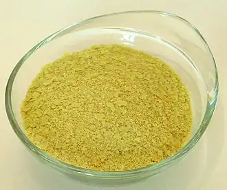 Nutritional yeast is a cooking yeast derived from a fungus, saccharomyces cerevisiae. It is sold in in powder and flake form, and is used most often in vegetarian and vegan cuisine to simulate creamy sauces such as fake cheese, but is also used as a general condiment.