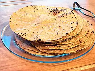 Papadam (also papadum, poppadom, papar, and appalam) is an Indian and Sri Lankan flatbread. Typically, it is prepared using black gram bean flour, rice flour, or lentil flour with salt and peanut oil added. The ingredients are made into a dough and formed into a thin, round shape similar to a tortilla. As the dough is prepared, the papadam can be seasoned with a variety of different ingredients such as chilies, cumin, garlic, black pepper, or other spices.