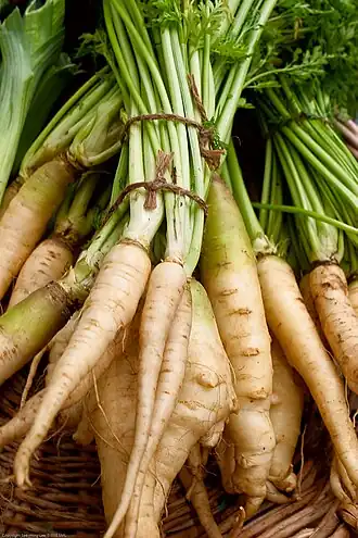 The parsnip looks like a pale carrot and is actually a relative of the carrot, celeriac, and parsley root. Commonly found in Europe, this root vegetable arrived to the United States with the colonists. Popular in the 19th and early 20th centuries for its celery flavor and nutty fragrance, this vegetable was often used in recipes that called for caloric decadence.