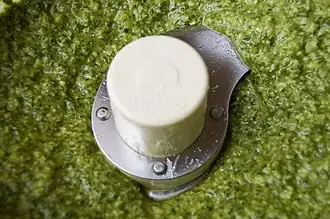 - Drop basil leaves through the top into the olive oil so that they are mulched up by the blades.