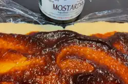 Mostarda Bolognese spread on the dough before baking Spread a generous layer of Mostarda Bolognese over the surface, leaving a clear border of 1 inch (2.5 cm) around the edges. This will reduce the risk of the jam leaking during the baking process.