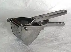 The potato ricer can be visualized as a very large garlic press. It is used in the preparation of mashed potatoes. After the potatoes have been slightly overcooked and chopped up, pass them through the potato-ricer to reduce them to a smooth purée. After potatoes are "riced," it is common to then mix butter, milk, or cream, according to preference.