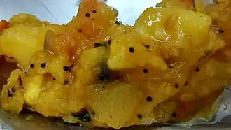 Potato masala (Tamil: uralai kizhangu masala) is a potato dish often served alongside roti or folded inside a dosa. The dosa and aloo masala combination, widely eaten in South India, is known as masala dosa. Coconut chutney is a common accompaniment.