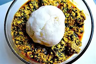 Pounded yam is a preparation of cooked yam that is pounded until smooth and stretchy. It is a type of Nigerian swallow.