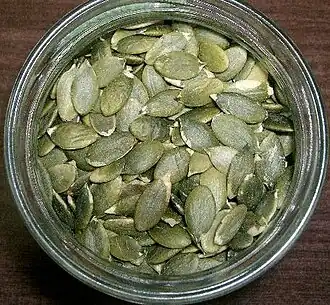 Edible pumpkin seeds (also called pepitas) are a popular ingredient in Mexican cooking. With their white hull removed, they are a medium-dark green and have a deliciously delicate flavor, which is even better when the seeds are roasted and salted.