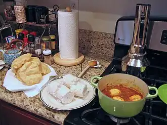 Puttu is a breakfast dish in Kerala, India. The main ingredients are rice flour and coconut. It is usually eaten with steamed bananas or Kadala Curry (chickpea curry), Chicken Curry, or boiled green gram (moong) and pappad.