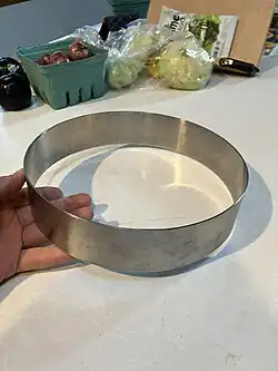A metal ring that holds crusts or thick batters in place while baking. Parchment paper can be folded tightly around the outside to hold in a cake, and then it's referred to as a cake ring. Or pate brisee dough can hold quiche batter and then it's called a quiche ring or a tart ring.