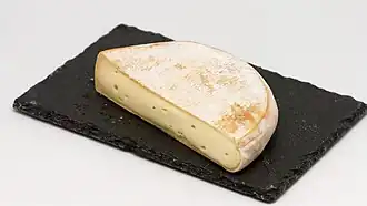 Reblochon is a French cheese from Savoie. Reblochon is produced in the valleys of Thônes and Val d'Arly. Reblochon is made from cow's milk. The cheese is a soft paste with a washed crust. Its crust is yellow saffron, covered with fine white foam, which shows it has been matured in a fresh cellar. It is best consumed between May and September after a maturation of between six and eight weeks. It is also excellent from March to December. Reblochon has a hazelnut taste. It is a vital ingredient of tartiflette, a Savoyard gratin with potatoes, cream and pork.